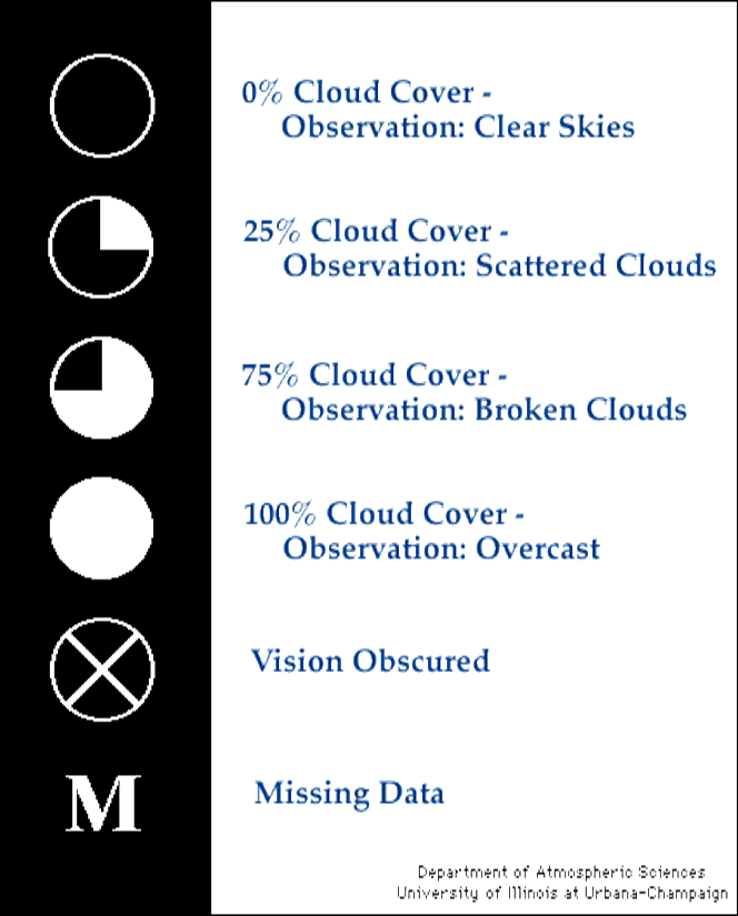 yellow indicates the amount of cloud cover observed at the time the observation