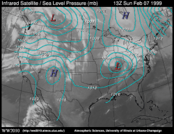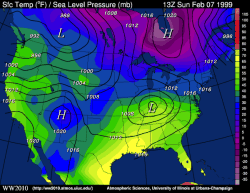 depicts temperature and sea-level pressure contours. It is useful for finding fronts and high and low pressure systems.