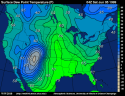 humid air. Dew points in the 40s or lower (light green, yellow or white) are
