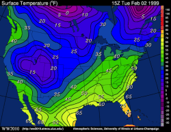 (below freezing) are shaded blue and purple. Areas of sharp temperature
