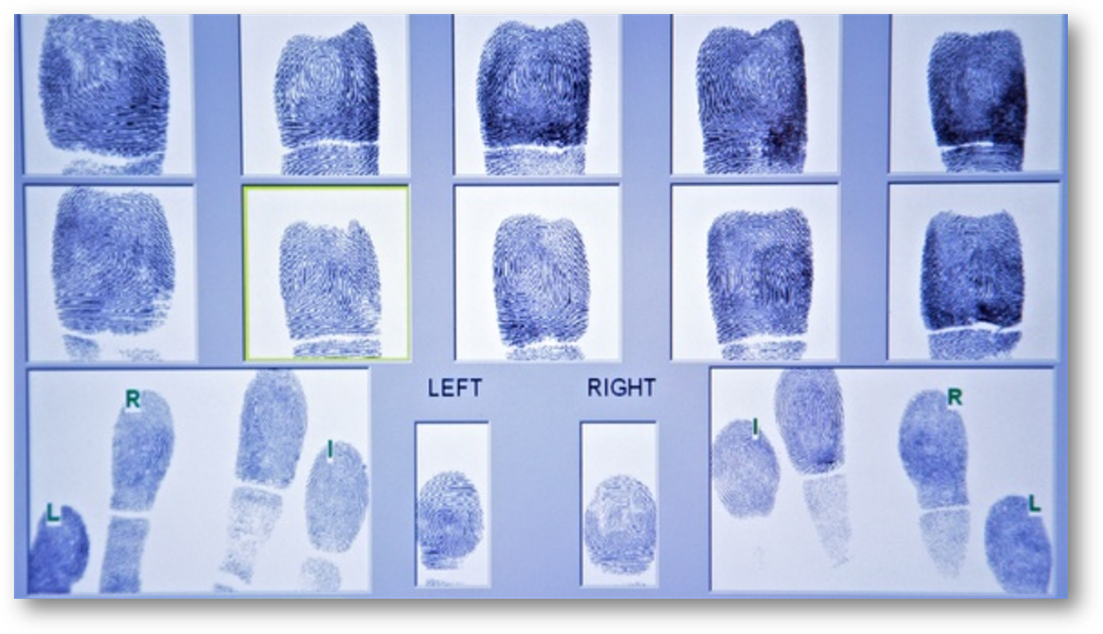 comparing fingerprints from a crime scene with a stack of prints pulled from
